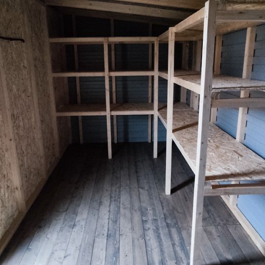 В хозблоке сделаны глубиной 55см длинные стеллажи, в которых вместятся все ваши вещи.